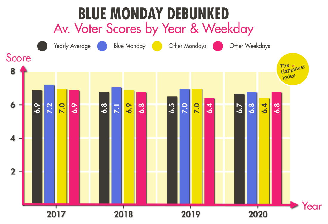 By analysing millions of customer data points we discovered…There’s no significant difference in average happiness scores between Blue Monday and any other Monday, or weekday!