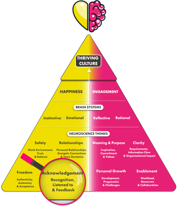 Recognition is a key part of acknowledgement, which helps drive our happiness. This is linked to the Emotional brain system in our neuroscience model.